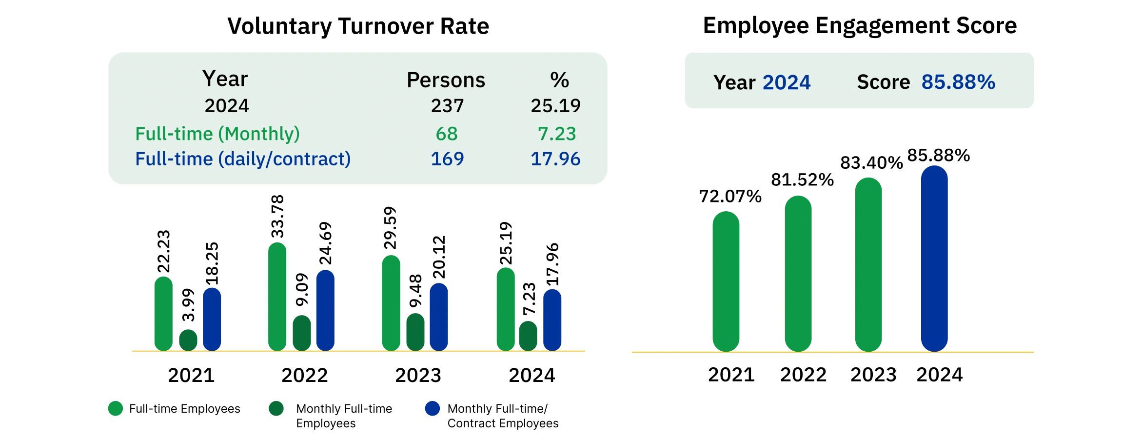 The company has developed and improved the employee engagement assessment to reflect factors impacting work within the organizational context. The assessment questions are designed to cover important dimensions of employee engagement, such as trust in management, pride in the organization, work-life balance, and motivation for development. The employee engagement assessment is conducted by the Labor and Human Rights Working Group in collaboration with the Human Resources Department and is set as an organizational goal. The company implements engagement assessments twice a year through three communication channels: the company’s online system, announcements during Morning Talk sessions, and direct distribution of assessment forms to employees.