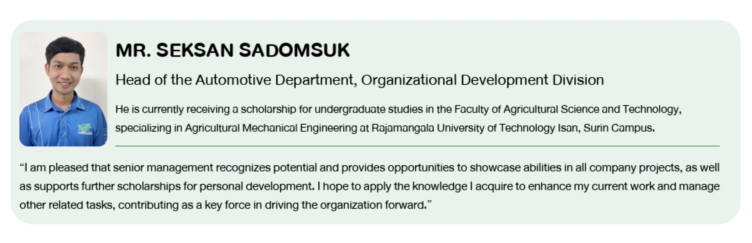 In 2024, 2 employees received scholarships at the undergraduate level in the fields of Industrial Engineering and Logistics from Pathum Thani University, and Agricultural Mechanical Engineering from Isan Technology University. To date, a total of 2 employees has received scholarships from the company, with a total scholarship amount of 129,000 THB. Both employees are still actively working with the company.