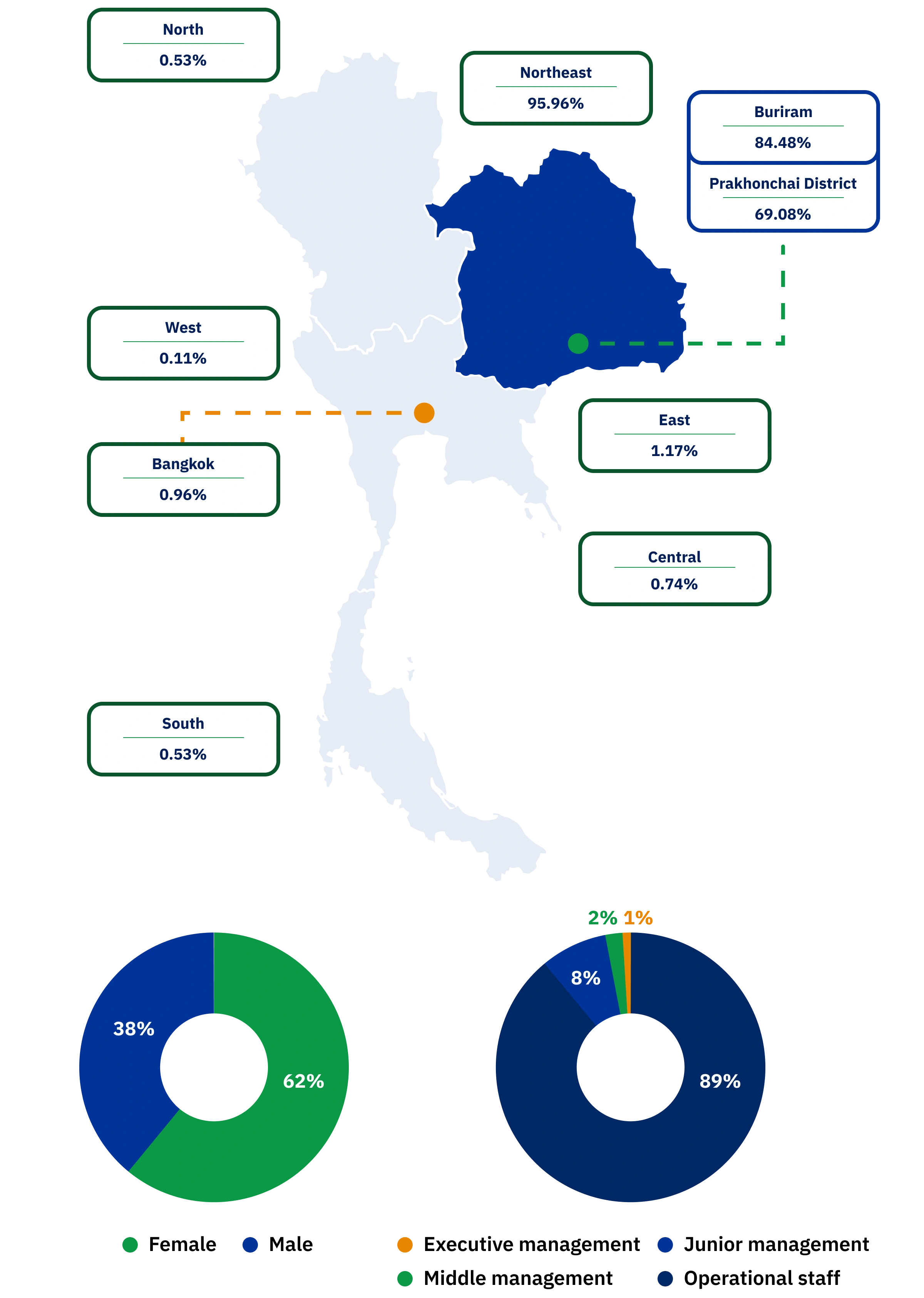 In 2024, the company employed 941 individuals, all of whom are Thais, representing 100%. Among these, 903 individuals, or 95.96%, are native to the Northeastern region. The majority of employees are from nearby communities, with 795 individuals residing in Buriram Province, accounting for 84.48%, and 650 individuals living in Prakhonchai District, where the company is located, representing 69.08% of the total workforce. Of this number, there are 11 persons with disabilities within Buriram Province, accounting for 1.17% of the total workforce, which is a higher proportion than that prescribed by law.