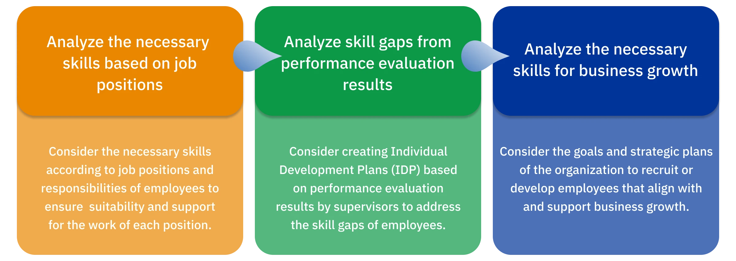 The company recognizes the importance of enhancing employees' knowledge and capabilities to keep pace with the changes in today's world. It focuses on developing a diverse range of skills that align with the company's business direction while unlocking the potential within individuals, enabling employees to grow in their career paths. The company has established a framework for analyzing employee development needs that encompasses both technical skills and other essential soft skills. This will ensure that employees can effectively apply their skills in their work and align with the business direction as follows: