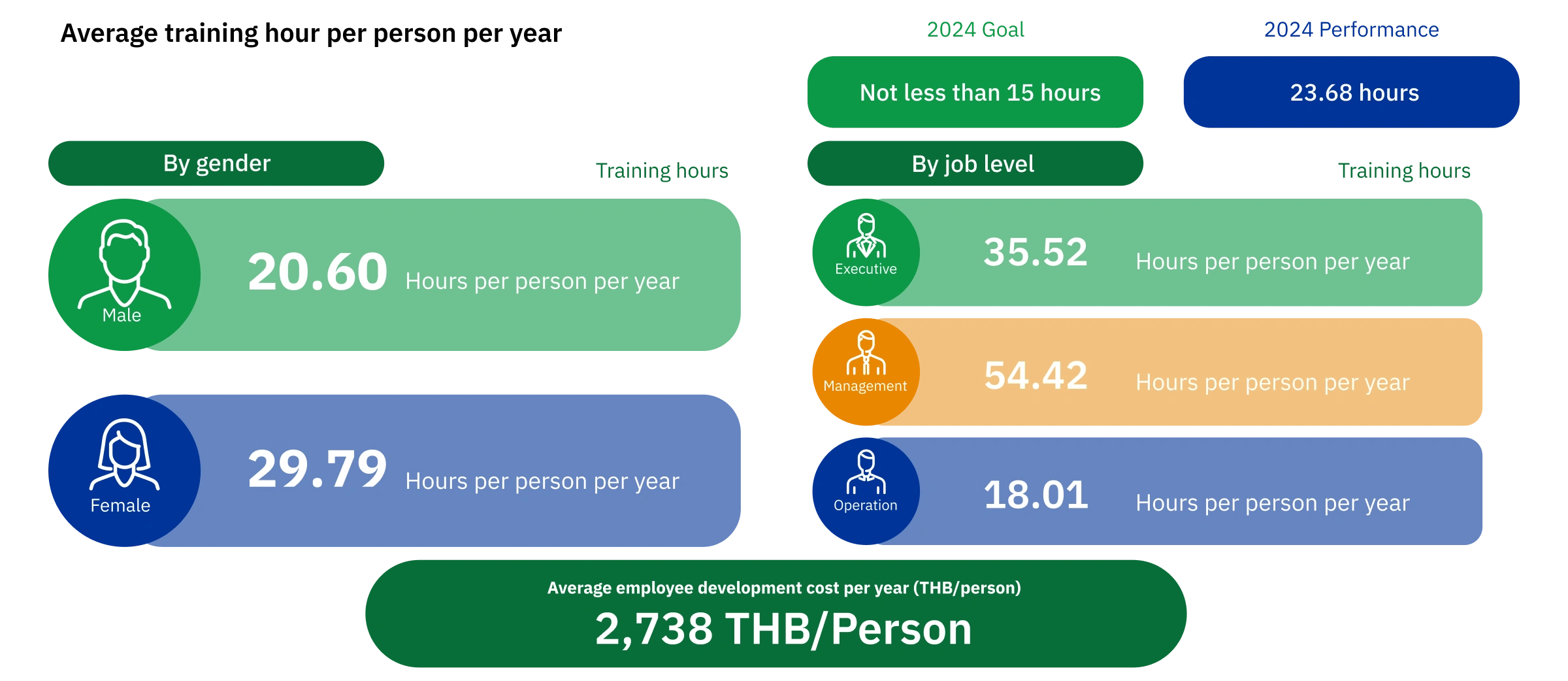In 2024, the company implemented various employee development initiatives through a range of projects and learning programs tailored to skill enhancement for both executive and operational levels. Employees averaged 23.68 training hours per person per year, exceeding the established goal and representing an 85.51% increase from 2023. The investment for skill development for employees amounted to 1,984,799 THB, or approximately 2,738 THB per person per year.