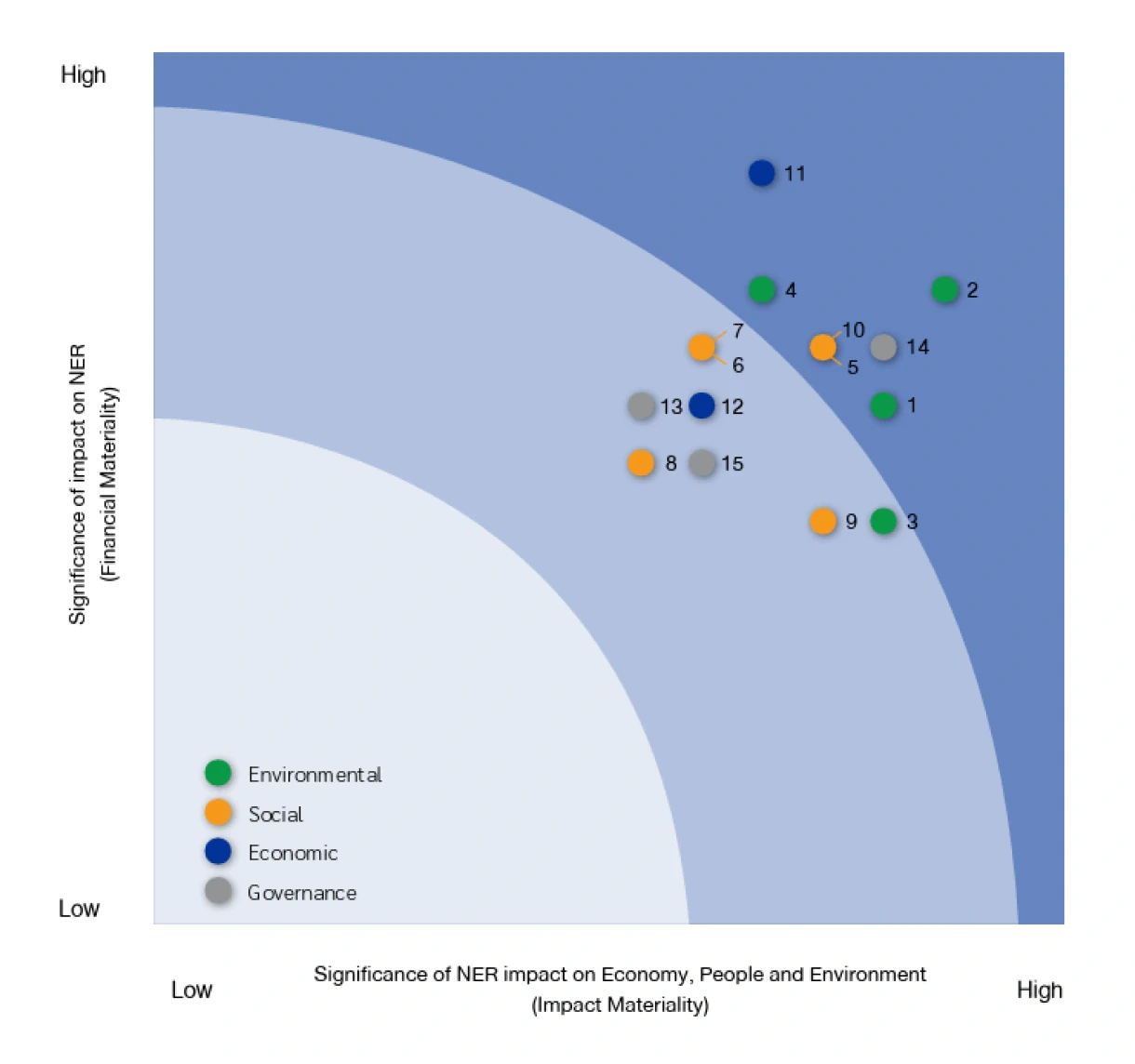 The horizontal axis (X-axis) indicates the significance level of impacts on the economy, society, and the environment resulting from the company’s business operations across various sustainability issues.