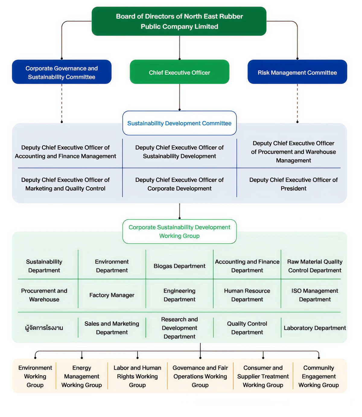 The company has established a Corporate Sustainability Development Committee which consists of six executives at the Deputy Chief Executive Officer level from all business units, with the Chief Executive Officer serving as the Chairperson of the committee. The Corporate Sustainability Development Working Group includes representatives from all business units of the company, totaling 56 members, and is led by Ms.Py Attpisarn, the Deputy Chief Executive Officer of Sustainability Development. The working group has been divided into six subcommittees to facilitate faster and more effective management of sustainability issues across all dimensions. The committees and working groups have the following responsibilities:
