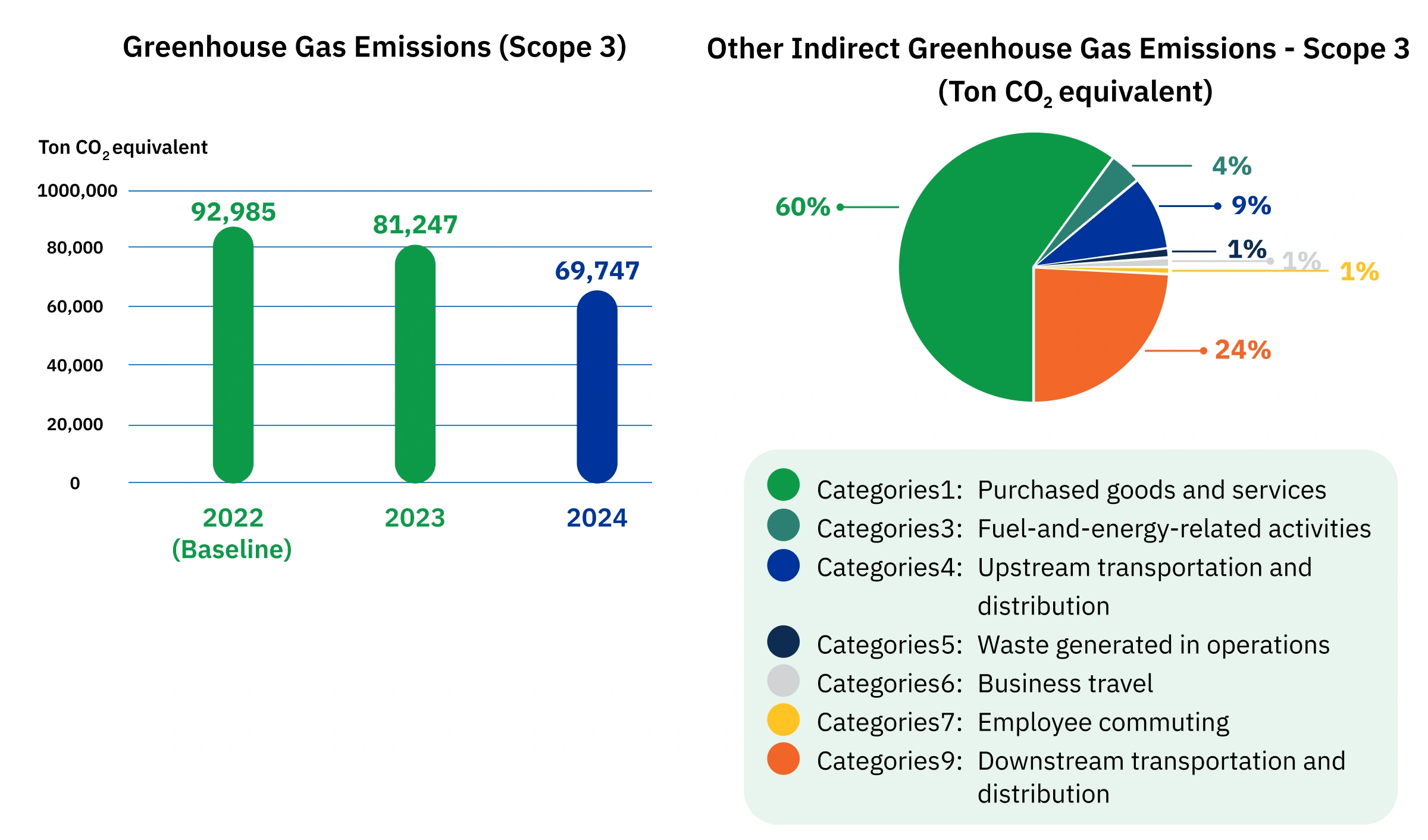 The company reported indirect greenhouse gas emissions in the supply chain (Scope 3) totaling 69,747 tons of carbon dioxide equivalent, representing a reduction of 14.15% compared to 2023 and a 24.99% decrease compared to the baseline year of 2021.