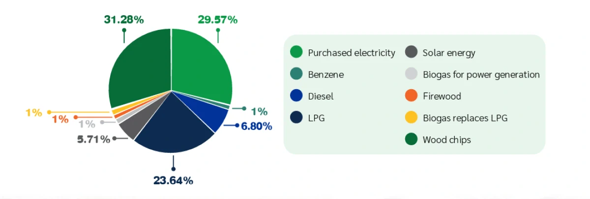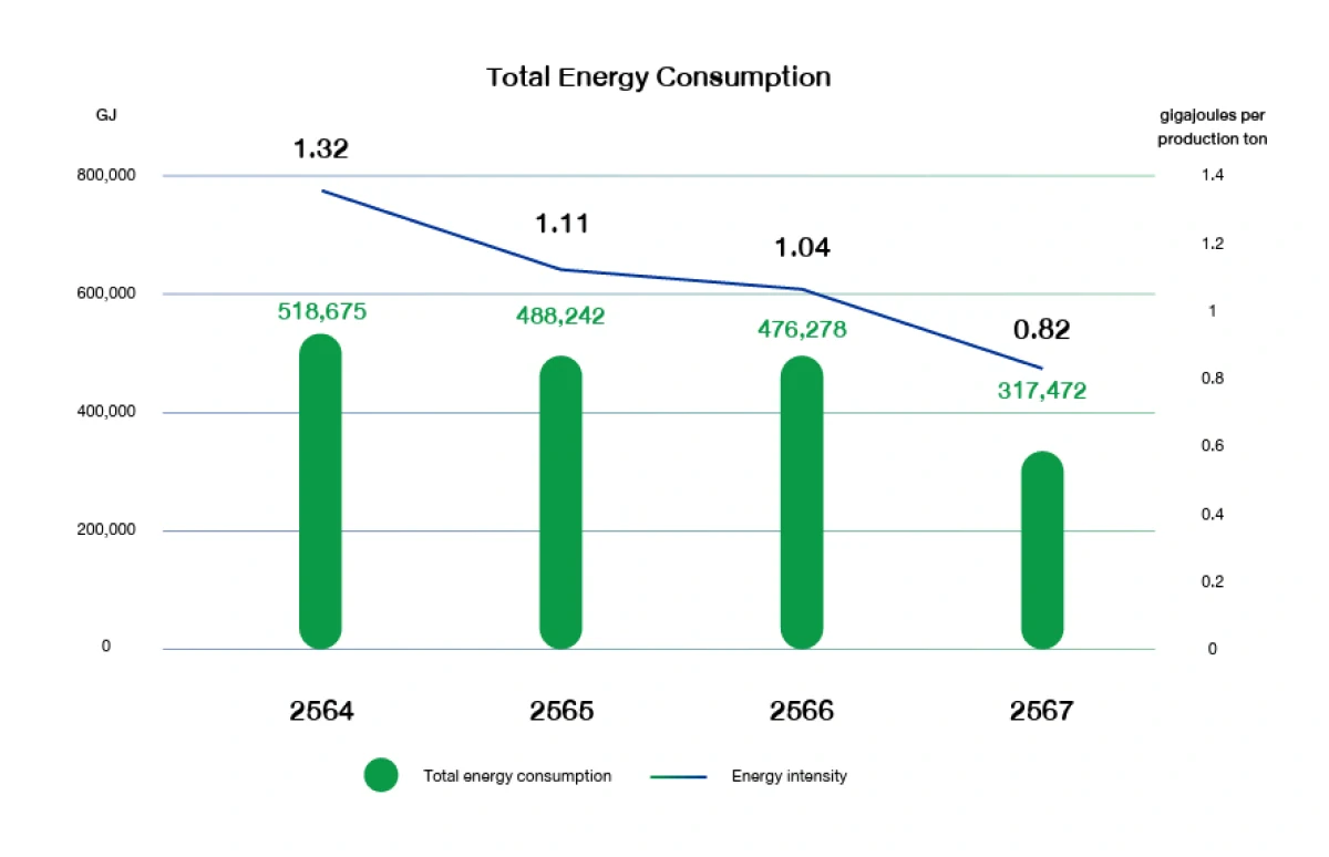 The company monitors and collects energy consumption data across 100% of its operational areas located in Buriram Province. In 2024, the company utilized a total of 317,471.94 gigajoules of energy across all processes, including production and office operations, representing a reduction of 34.98% compared to 2023. This decrease can be attributed not only to the implementation of energy efficiency projects and measures throughout the year but also to improvements in production processes that significantly reduced overall production capacity, including a notable decrease in the production of biogas from Napier grass. Despite the reduction in total energy consumption, the energy intensity for 2024 was recorded at 0.82 gigajoules per ton of production, reflecting a decrease of 21.75% compared to 2023. This indicates more efficient energy usage in the production process. Additionally, the proportion of renewable energy consumption to total energy consumption was 39.41%, in line with the targets set for 2024.