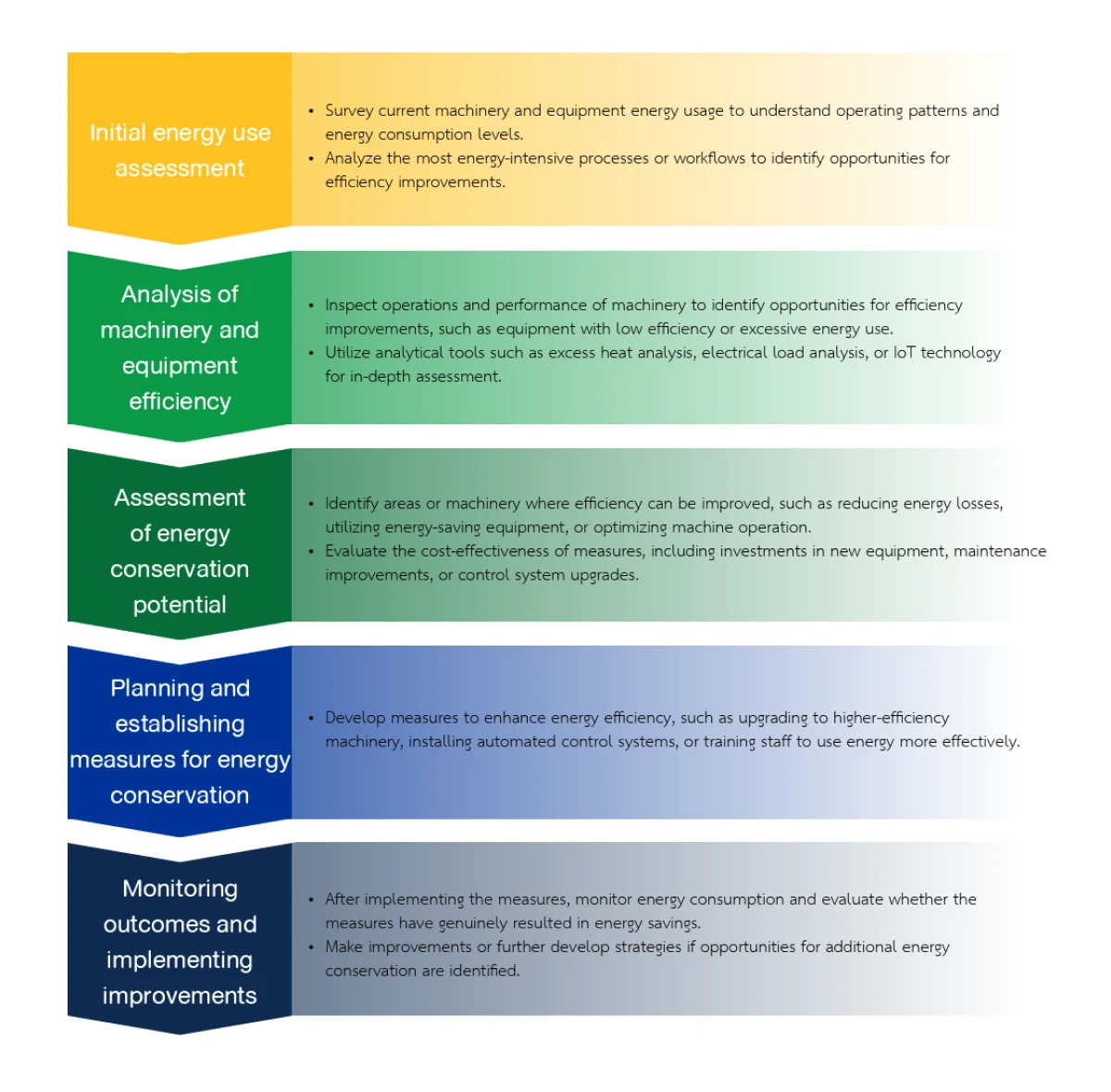 The company defines its energy management approach based on the PDCA (Plan-Do-Check-Act) principles and a process focused on systematically analyzing and improving energy efficiency through the assessment of the potential of significant machinery and equipment to establish appropriate energy conservation measures as follows:
