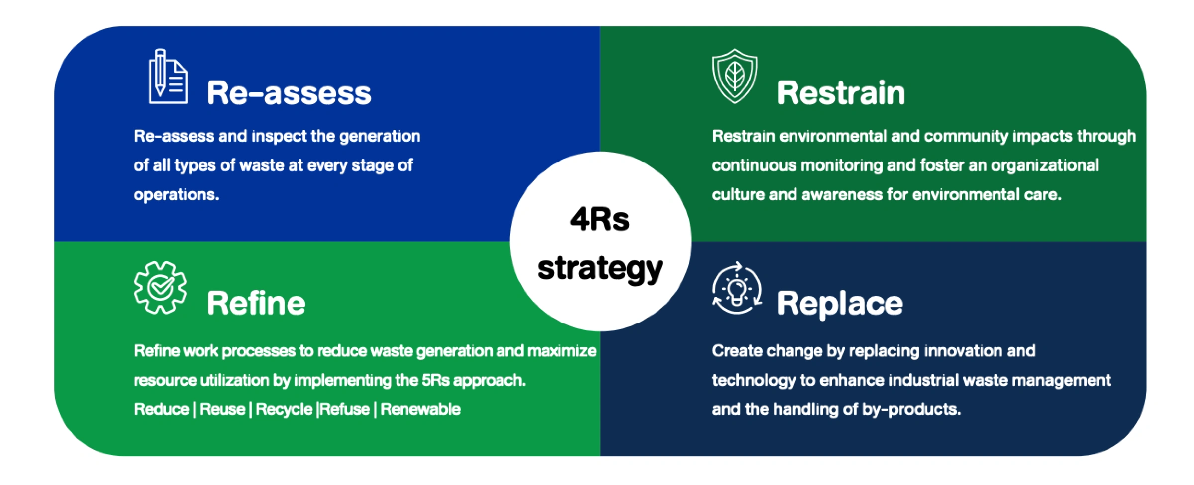 The company adopts the principles of a circular economy and the "5Rs" approach, which include Reduce, Reuse, Recycle, Refuse, and Renewable. This is implemented under the 4Rs strategy—Re-assess, Restrain, Refine, and Replace—to systematically manage waste and reduce the risks of impacts on both the surrounding community and the environment.