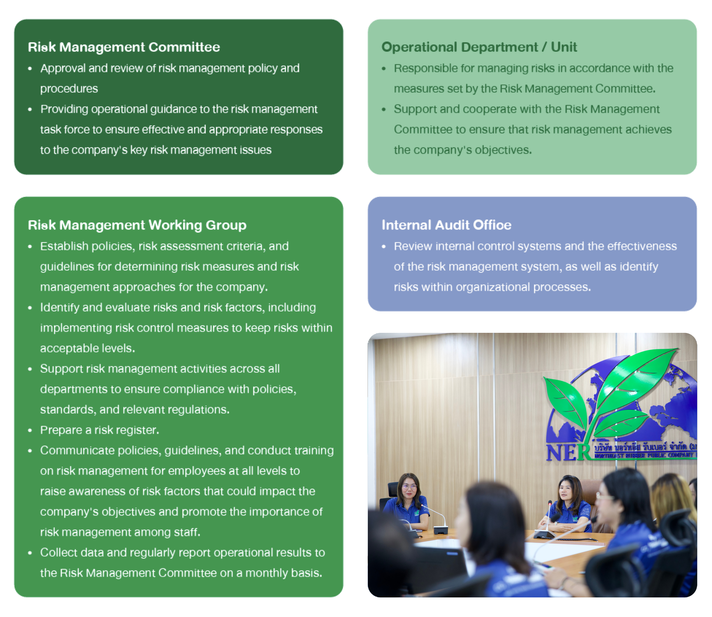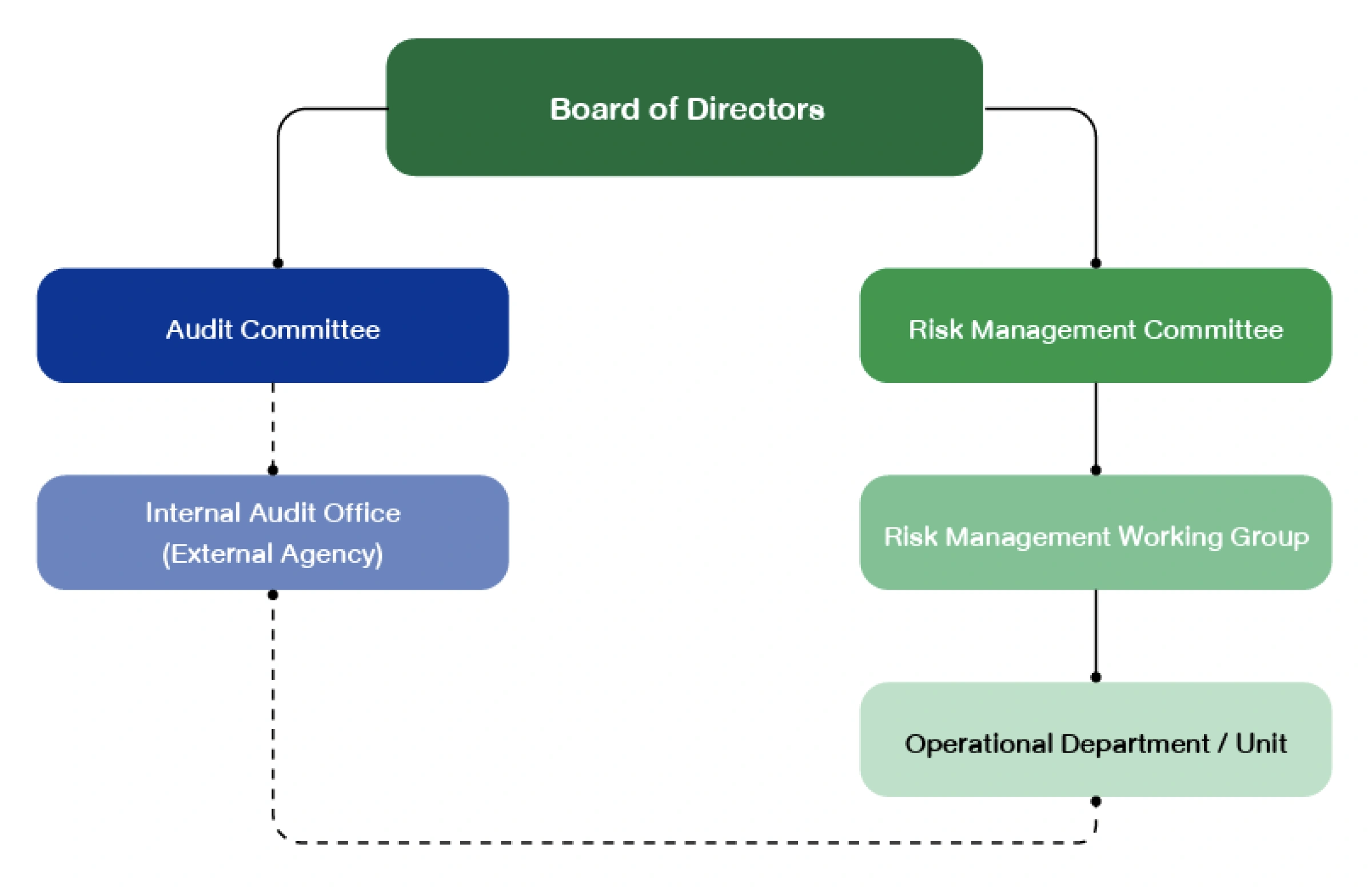 - The company managed organizational risks by holding meetings of the Risk Management Working Group, which includes senior executives, departmental managers, and operational staff, to monitor organizational risk management. Additionally, specific risk indicators and risk appetite were established, along with a Risk Mitigation Plan, which includes setting targets and performance indicators. Continuous monitoring and evaluation of the risk level after implementation were conducted to closely identify control measures. The outcomes were reported to the Risk Management Committee monthly.