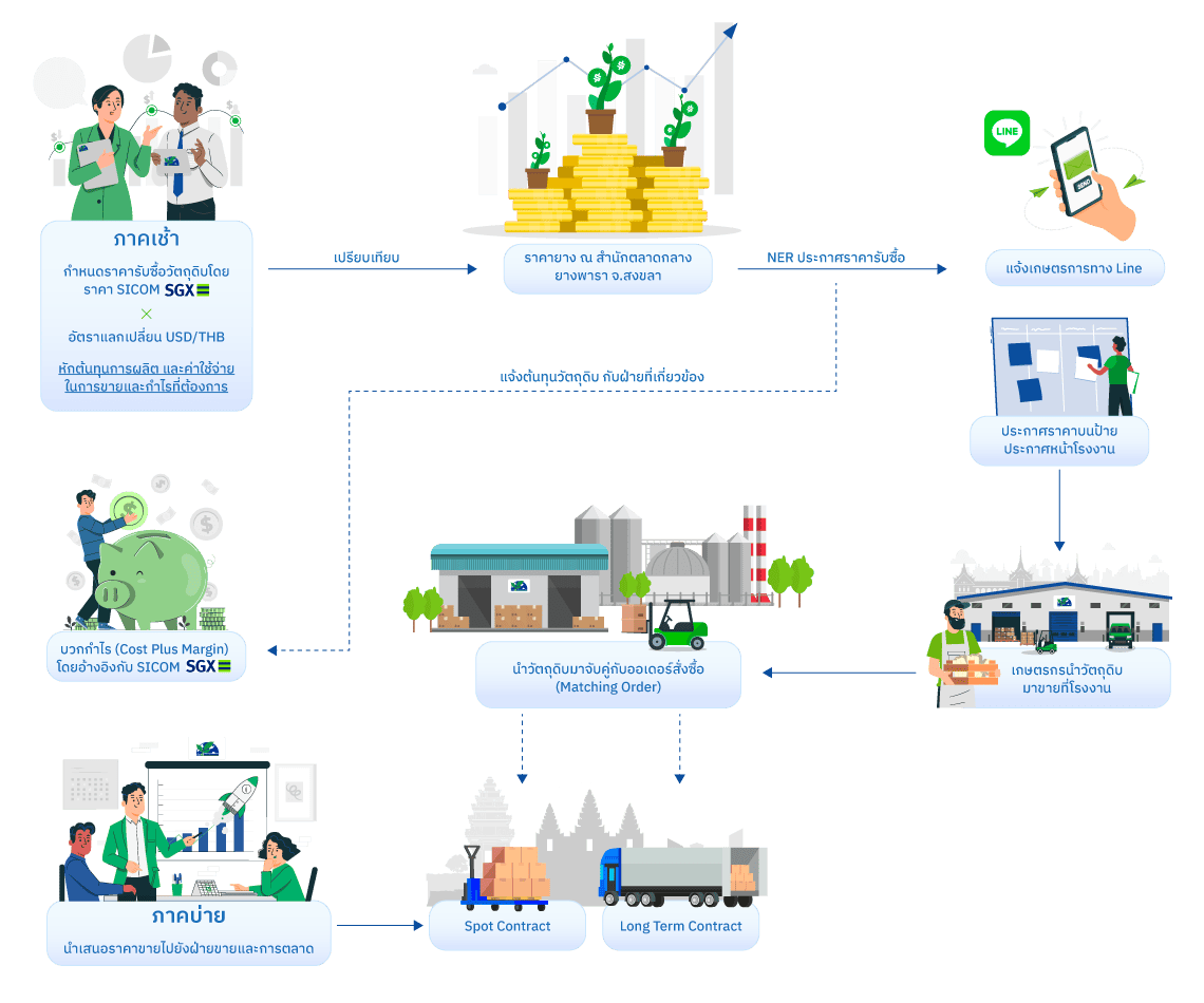 สําหรับผลิตภัณฑ์ยางธรรมชาติ บริษัทฯ ใช้กลยุทธ์ในการจับคู่ซื้อขาย Matching Order ระหว่างปริมาณซื้อวัตถุดิบกับปริมาณขายสินค้าในแต่ละช่วงเวลาให้ สอดคล้องกัน เพื่อป้องกันความเสี่ยงจากความผันผวนของราคายางพารา โดยฝ่ายการตลาดจะกําหนดราคาขายสินค้า ตามต้นทุนของวัตถุดิบ ต้นทุนการ ผลิต และบวกด้วยอัตรากําไรขั้นต้นที่ต้องการ (Cost Plus Margin) ควบคู่ไปกับการพิจารณาราคาของตลาดซื้อขายยางพาราล่วงหน้าสิงคโปร์ (Singapore Commodity Exchange : SICOM), ตลาดซื้อขายยางพาราล่วงหน้าเซี่ยงไฮ้ (Shanghai Future Exchange : SHFE) เพื่อเป็นข้อมูลในการพิจารณากําหนด ราคาขายให้แก่ลูกค้า