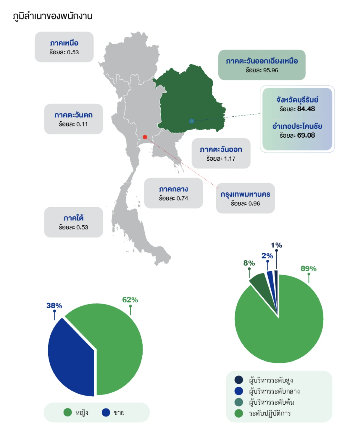 ในปี 2567 บริษัท ฯ มีพนักงาน 941 คน เป็นคนไทยทั้งหมดร้อยละ 100 โดยเป็นคนที่มีภูมิลำเนาในภาคตะวันออกเฉียงเหนือจำนวนถึง 903 คน หรือร้อยละ 95.96 จากจำนวนพนักงานทั้งหมด พนักงานส่วนใหญ่เป็นคนจากในชุมชนใกล้เคียง ได้แก่ พนักงานที่ภูมิลำเนาอยู่ในพื้นที่จังหวัดบุรีรัมย์ จำนวน 795 คน คิดเป็นร้อยละ 84.48 และอยู่ในอำเภอประโคนชัย ซึ่งเป็นที่ตั้งของบริษัท ฯ ถึง 650 คน หรือคิดเป็นร้อยละ 69.08 ของพนักงานทั้งหมด