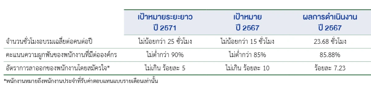 ในปี 2567 บริษัท ฯ ได้ดำเนินการพัฒนาพนักงานผ่านหลากหลายโครงการและหลักสูตรการเรียนรู้ที่เหมาะสมกับทักษะที่ต้องการพัฒนาทั้งระดับผู้บริหารและระดับปฏิบัติการอย่างทั่วถึง โดยพนักงานมีจำนวนชั่วโมงอบรมเฉลี่ยต่อคนต่อปีเท่ากับ 23.68 ชั่วโมง ซึ่งมากกว่าเป้าหมายที่ตั้งไว้ และเพิ่มขึ้นจากปี 2566 ถึงร้อยละ 85.51 มูลค่าการลงทุนเพื่อพัฒนาทักษะให้แก่พนักงานเป็นเงิน 1,984,799 บาท หรือคิดเป็น 2,738 บาทต่อคนต่อปี