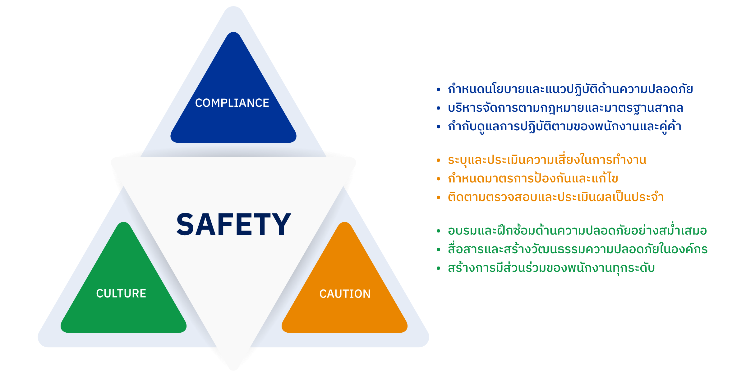 บริษัท ฯ เชื่อมั่นว่า การสื่อสารและการสร้างการมีส่วนร่วมในด้านความปลอดภัยเป็นปัจจัยสำคัญในการเสริมสร้างความตระหนักรู้และปลูกฝังพฤติกรรมด้านความปลอดภัยให้แก่พนักงานในทุกระดับ เพื่อให้เกิดความเข้าใจและการปฏิบัติที่ถูกต้อง ดังนั้น บริษัท ฯ จึงได้แต่งตั้งคณะกรรมการด้านความปลอดภัย อาชีวอนามัย และสภาพแวดล้อมในการทำงาน ซึ่งประกอบด้วยสมาชิกจากฝ่ายต่างๆ จำนวน 19 ท่าน เพื่อส่งเสริมและสนับสนุนกิจกรรมด้านความปลอดภัย รวมทั้งให้คำปรึกษาและแนะนำแก่พนักงานทุกระดับ ผู้รับเหมา และบุคคลที่เข้ามาปฏิบัติงานในบริษัทฯ เพื่อให้เกิดการแลกเปลี่ยนความรู้และประสบการณ์ด้านความปลอดภัย