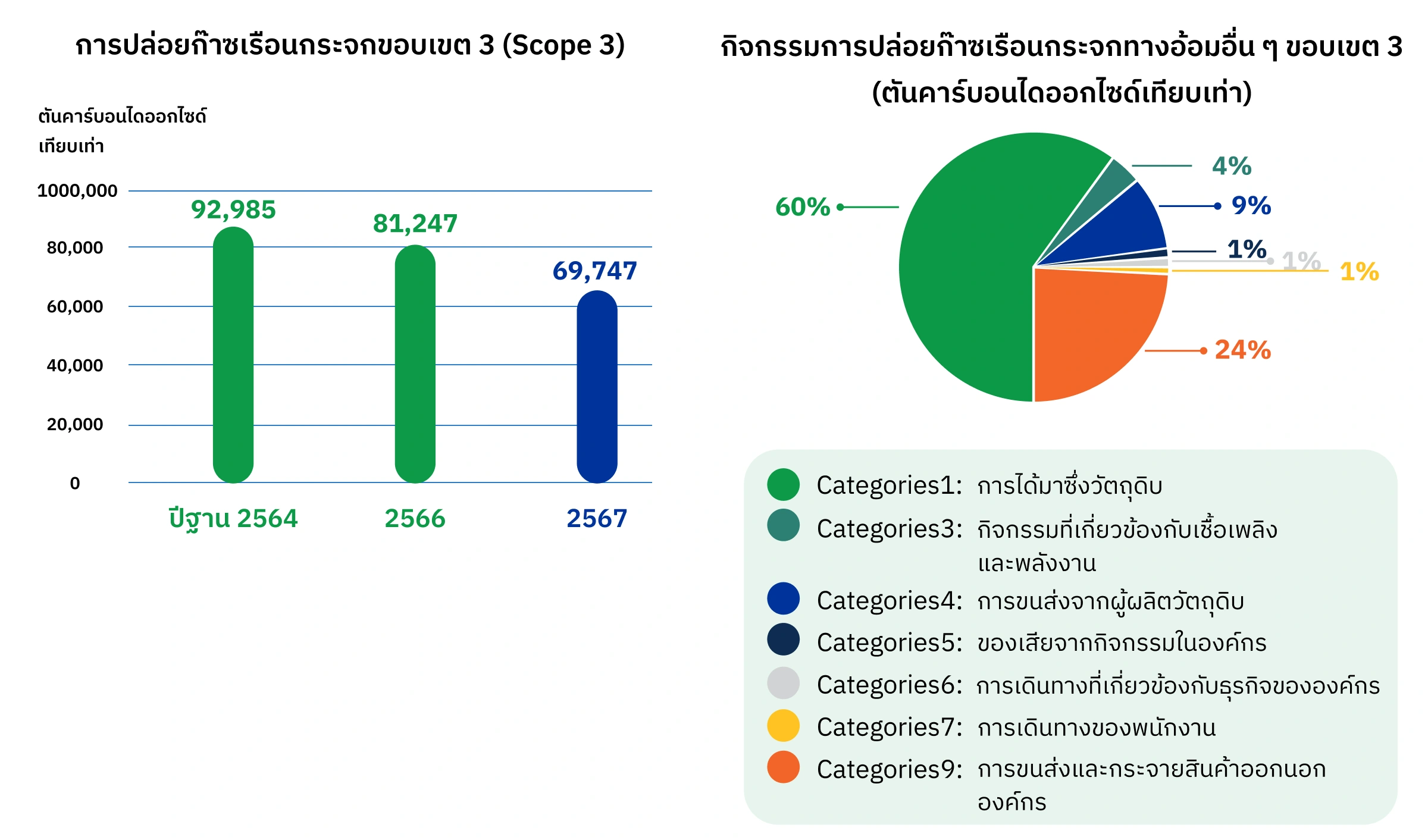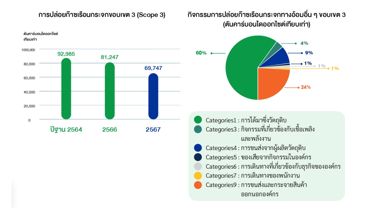บริษัท ฯ มีการปล่อยก๊าซเรือนกระจกทางอ้อมอื่นๆ (ขอบเขต 3) จำนวนรวม 69,747 ตันคาร์บอนไดออกไซด์เทียบเท่า ลดลงร้อยละ 14.15 เมื่อเทียบกับปี 2566 และลดลงร้อยละ 24.99 เทียบกับปีฐาน 2564