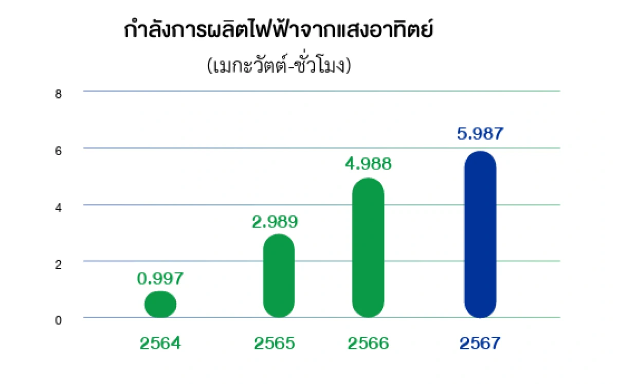 สามารถผลิตไฟฟ้าจากพลังงานแสงอาทิตย์ มาทดแทนการใช้ไฟฟ้าในกระบวนการผลิตรวมทั้งหมด 5,036,445 กิโลวัตต์-ชั่วโมง คิดเป็นร้อยละ 16.08 ของปริมาณการใช้ไฟฟ้าทั้งหมดในกระบวนการผลิต ทำให้สามารถลดการปล่อยก๊าซเรือนกระจกทางอ้อมจากการซื้อไฟฟ้า (ขอบเขต 2) จำนวน 2,518 ตันคาร์บอนไดออกไซด์เทียบเท่าต่อปี