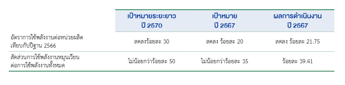 จากการดำเนินงานการจัดการพลังงานเป้าหมายและผลการดำเนินงานที่สำคัญแสดงดังตาราง