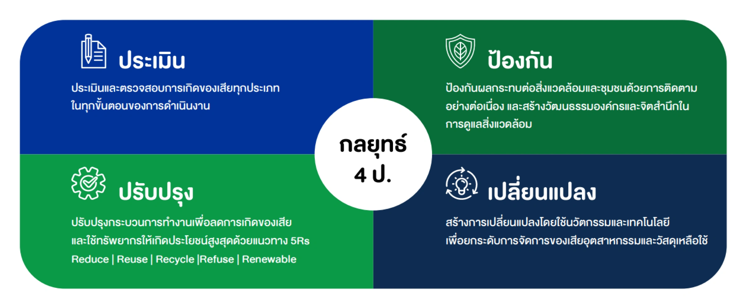บริษัท ฯ ใช้หลักการเศรษฐกิจหมุนเวียนและและแนวทาง 5Rs ได้แก่ Reduce (ลดการใช้ทรัพยากร), Reuse (การใช้ซ้ำ), Recycle (การแปรรูปมาใช้ใหม่), Refuse (ปฏิเสธการใช้สารที่ไม่เป็นมิตรต่อสิ่งแวดล้อม) และ Renewable (การใช้ทรัพยากรหมุนเวียน) ในการดำเนินงานตามกลยุทธ์ 4 ป. “ประเมิน ป้องกัน ปรับปรุง เปลี่ยนแปลง” เพื่อจัดการขยะอย่างเป็นระบบและลดความเสี่ยงในการเกิดผลกระทบทั้งต่อชุมชนโดยรอบและสิ่งแวดล้อม