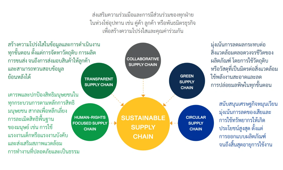 บริษัทฯ ให้ความสำคัญกับการบริหารจัดการห่วงโซ่อุปทานอย่างมีความรับผิดชอบและยั่งยืน เพื่อลดความเสี่ยงจากคู่ค้าที่อาจส่งผลกระทบต่อธุรกิจ รวมถึงสิ่งแวดล้อมและสิทธิมนุษยชนของผู้มีส่วนได้เสียกลุ่มต่างๆ นอกจากนี้ บริษัท ฯ ยังมุ่งเน้นการพัฒนาห่วงโซ่อุปทานให้มีความโปร่งใส เป็นธรรม มีความยืดหยุ่น และสอดคลัองกับคุณภาพมาตรฐานในระดับสากล บริษัท ฯ จึงได้กำหนดกลุ่ม “นโยบายด้านการจัดซื้อ” ซึ่งประกอบด้วย