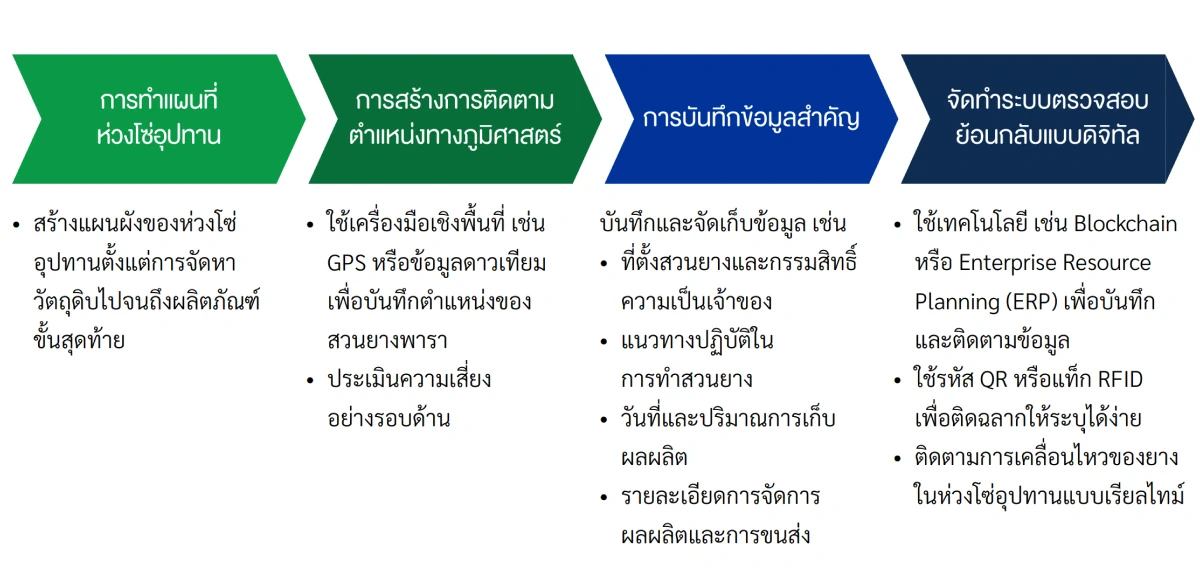 การตรวจสอบการได้มาของวัตถุดิบยางเป็นกระบวนการสำคัญในการดำเนินงานที่จะสามารถสร้างความโปร่งใสตลอดห่วงโซ่อุปทานของการดำเนินธุรกิจของบริษัท ฯ เพื่อให้มั่นใจว่าวัตถุดิบที่ได้จัดหามานั้นมีความถูกต้องตามมาตรฐาน ทั้งในด้านคุณภาพ กฎหมาย และจริยธรรม รวมถึงป้องกันปัญหาที่อาจเกิดจากการจัดซื้อ ซึ่งทางบริษัทฯ ได้ดำเนินการตามแนวทางดังนี้