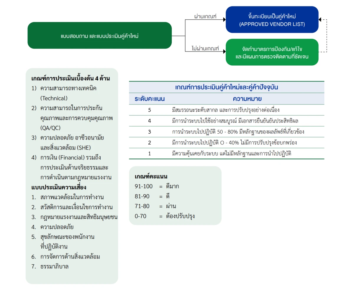 เมื่อคู่ค้าใหม่ที่มีผลคะแนนผ่านเกณฑ์และไม่มีความเสี่ยงด้านเศรษฐกิจ สังคม สิ่งแวดล้อม และธรรมาภิบาล ลงนามรับทราบจรรยาบรรณคู่ค้า บริษัท ฯ จะดำเนินการขึ้นทะเบียนคู่ค้าใหม่ต่อไป แต่หากคะแนนไม่ผ่านเกณฑ์การประเมินหรือมีความเสี่ยง คู่ค้าต้องดำเนินการแก้ไขหรือจัดทำมาตรการป้องกันและมีแผนการตรวจติดตามที่ชัดเจน เพื่อให้คะแนนอยู่ในระดับที่ยอมรับได้จึงจะสามารถขึ้นทะเบียนคู่ค้าใหม่กับบริษัทฯ ได้