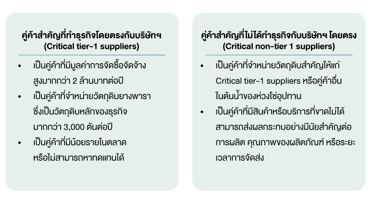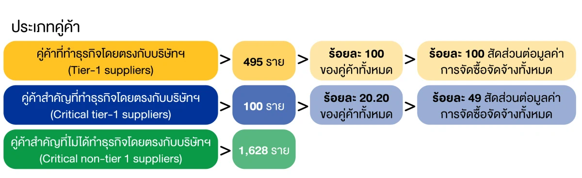 บริษัท ฯ ได้ทำการวิเคราะห์และระบุกลุ่มคู่ค้าสำคัญ (Critical suppliers) จากคู่ค้าและผู้รับเหมาที่ส่งมอบสินค้าและบริการในห่วงโซ่อุปทานทั้งหมด โดยใช้เกณฑ์พิจารณากลุ่มคู่ค้าสำคัญจาก มูลค่าการจัดซื้อจัดจ้าง การเป็นผู้ขายสินค้าที่เป็นองค์ประกอบสำคัญของธุรกิจ และการเป็นผู้ขายน้อยรายในตลาดหรือไม่สามารถหาสินค้าอื่นทดแทนได้ ดังนี้