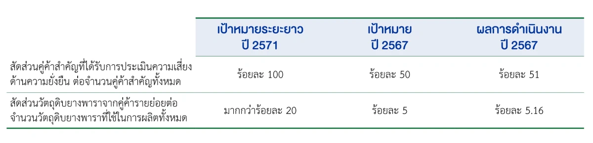 จากกการดำเนินงานเพื่อการพัฒนาการบริหารห่วงโซ่อุปทานอย่างยั่งยืนเป้าหมายและสรุปผลการดำเนินงานที่สำคัญแสดงดังตาราง