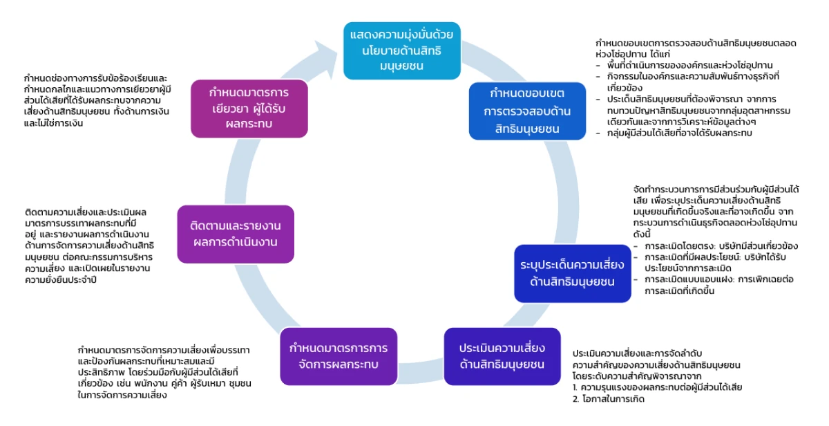 บริษัท ฯ กำหนดให้มีการตรวจสอบด้านสิทธิมนุษยชนอย่างรอบด้าน (Human Rights Due Diligence: HRDD) อย่างน้อยปีละหนึ่งครั้ง เพื่อระบุและประเมินความเสี่ยง ตลอดจนกำหนดมาตรการแก้ไขและป้องกันการละเมิดสิทธิมนุษยชนในทุกกิจกรรมทางธุรกิจ รวมถึงการดำเนินงานของผู้ที่เกี่ยวข้องตลอดห่วงโซ่อุปทาน โดยมีกระบวนการดำเนินงานที่สอดคล้องกับหลักการของสหประชาชาติว่าด้วยการดําเนินธุรกิจและสิทธิมนุษยชน (UN Guiding Principles on Business and Human Rights : UNGP) และหลักการสิทธิในการให้ฉันทานุมัติอย่างเป็นอิสระของชนเผ่าพื้นเมืองโดยได้ข้อมูลล่วงหน้า (Free, Prior and Informed Consent (FPIC) for Indigenous Peoples) โดยมีกระบวนการการตรวจสอบด้านสิทธิมนุษยชนอย่างรอบด้าน ดังนี้