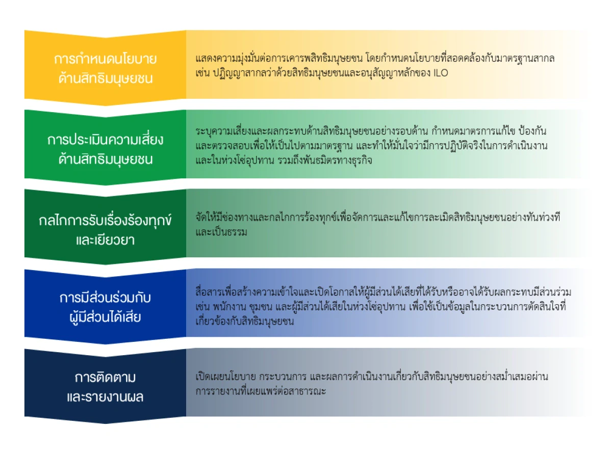 บริษัท ฯ ได้จัดทำ “นโยบายสิทธิมนุษยชน” และคู่มือการปฏิบัติด้านสิทธิมนุษยชนที่สอดคล้องตามหลักการของสหประชาชาติว่าด้วยการดําเนินธุรกิจและสิทธิมนุษยชน (UN Guiding Principles on Business and Human Rights : UNGP) และแนวทางการตรวจสอบอย่างรอบด้านสำหรับการดำเนินธุรกิจอย่างรับผิดชอบ (OECD Due Diligence Guidance For Responsible Business Conduct) ปฏิญญาสากลว่าด้วยสิทธิมนุษยชน (Universal Declaration of Human Rights: UDHR) รวมถึงกฎหมายในประเทศไทยและต่างประเทศที่เกี่ยวข้องกับการดำเนินธุรกิจ เพื่อใช้เป็นแนวทางสำหรับคณะกรรมการบริษัท ผู้บริหาร และพนักงานในทุกระดับ ให้ปฏิบัติต่อผู้มีส่วนได้เสียทุกกลุ่มในทุกกิจกรรมตลอดห่วงโซ่อุปทาน ตามหลักสิทธิมนุษยชนและเคารพในศักดิ์ศรีความเป็นมนุษย์ สิทธิและเสรีภาพ อย่างเท่าเทียมกัน