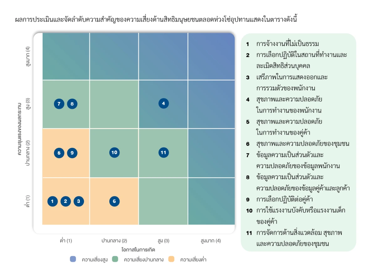 บริษัทฯ พบว่ามีประเด็นด้านสิทธิมนุษยชนที่เกี่ยวข้องกับการดำเนินงานตลอดห่วงโซ่อุปทาน ดังนี้