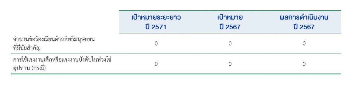 จากการดำเนินงานด้านสิทธิมนุษยชนในห่วงโซ่อุปทานเป้าหมายและผลการดำเนินงานที่สำคัญแสดงดังตาราง
